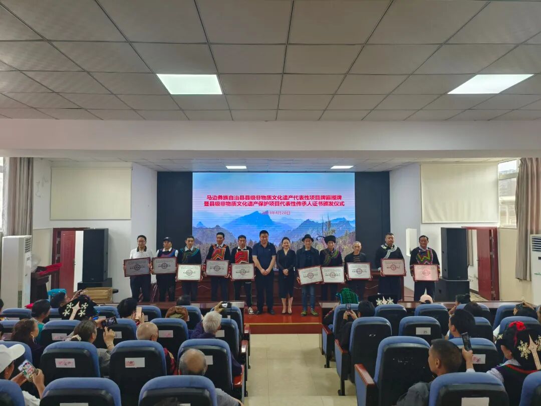 为推动非遗技艺保护传承与合理利用,2023年4月20日上午,县文体旅游局举行马边彝族自治县县级非物质文化遗产代表性项目牌匾授牌暨县级非物质文化遗产保护项目代表性传承人证书颁发仪式,为新增的38项县级非物质文化遗产代表性项目授牌,为123名县级非物质文化遗产保护项目代表性传承人颁发证书。